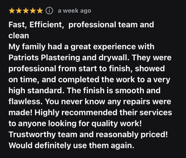 Patriot Plastering transformed my home beautifully; their craftsmanship and attention to detail are unmatched!